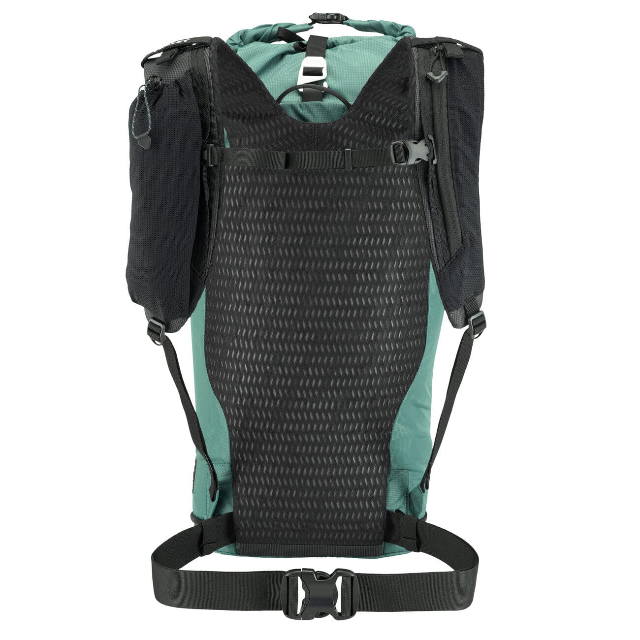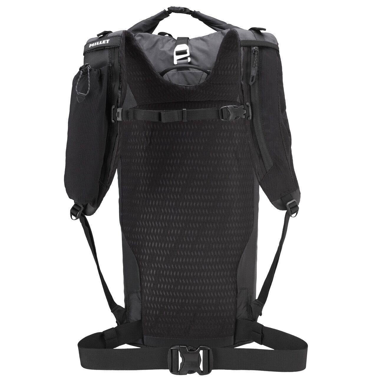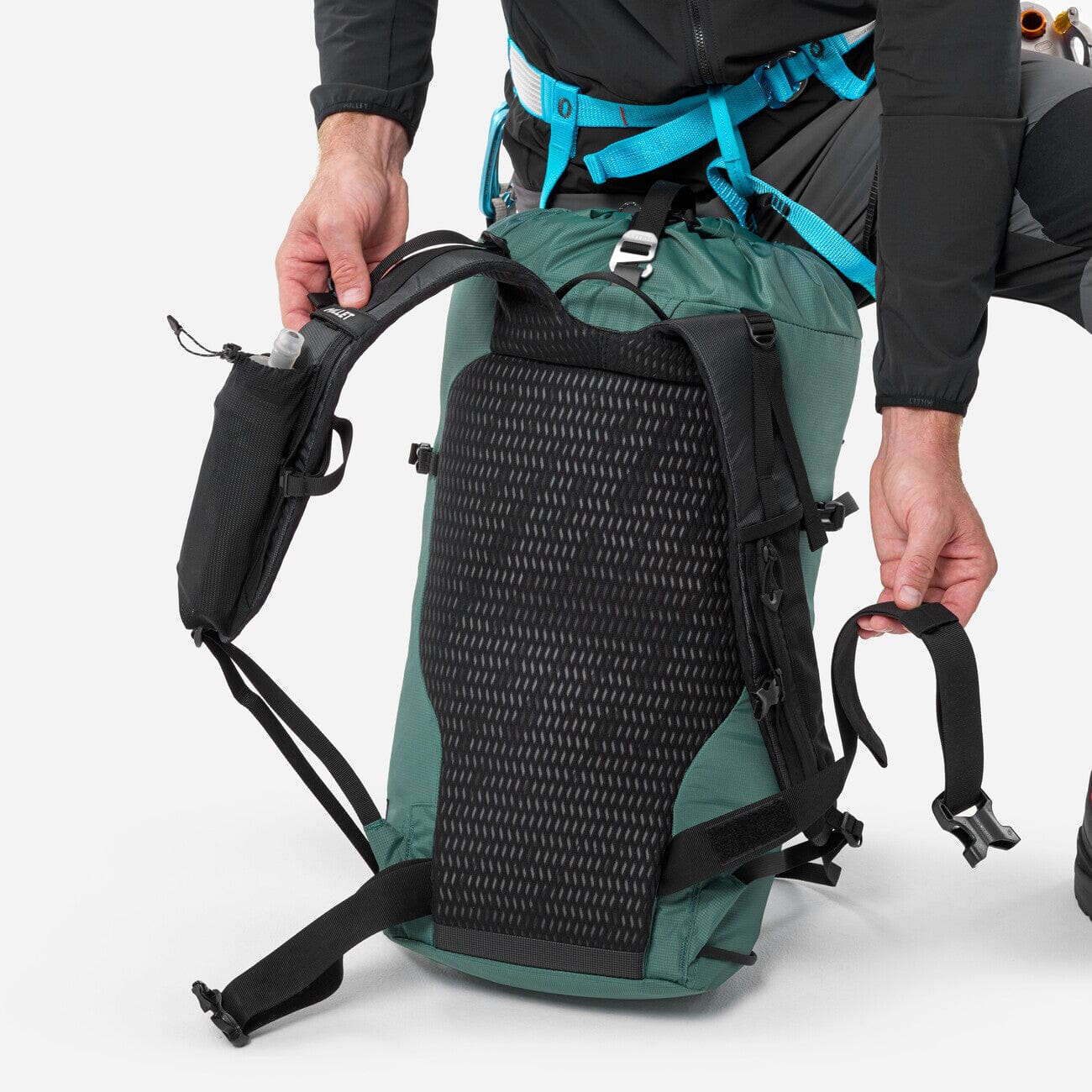 It’s designed for a technical mountain day load: water, layers, safety kit and lightweight equipment. The waist strap, chest strap, load lifters and side compression system help stabilize the load and reduce movement on uneven terrain.