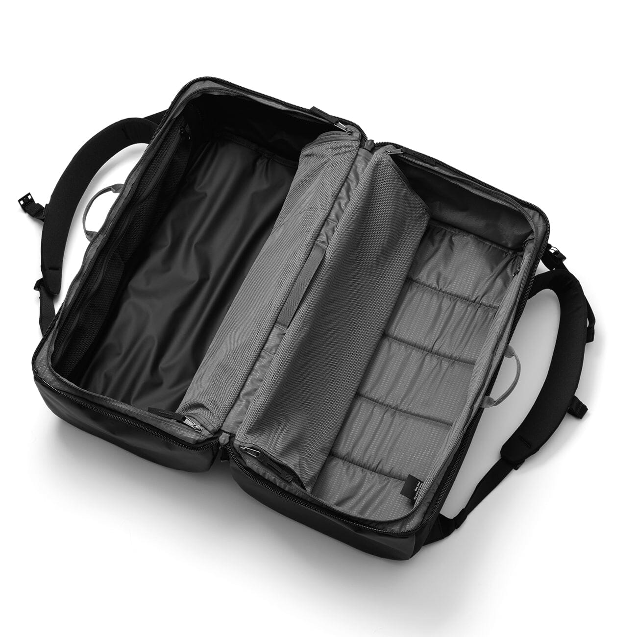 Le système split clamshell divise le sac en deux compartiments égaux pour séparer vêtements, chaussures, matériel ou affaires humides sans fouiller. Organisation type valise, dans une coque robuste de voyage.