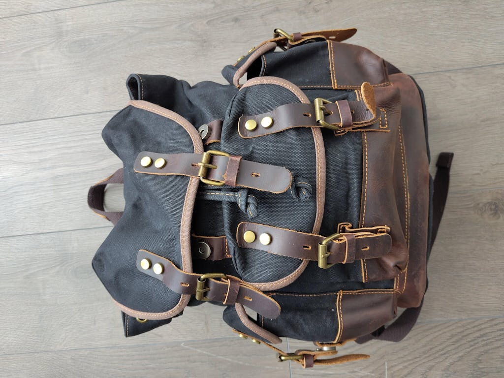Matériaux principal : Toile de coton cirée (canevas) et cuir Crazy Horse (cuir pleine fleur immergé dans l'huile)